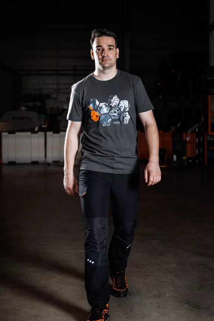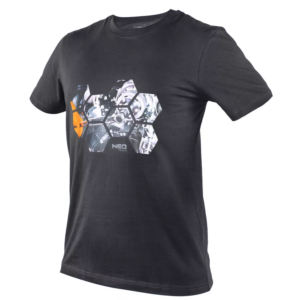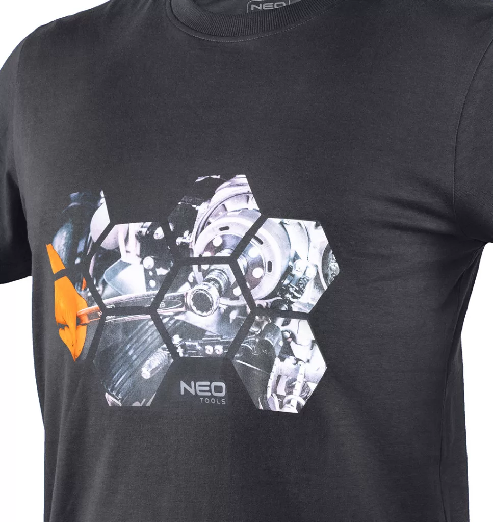 NEO 81-680 MUNKAVÉDELMI PÓLÓ, HATSZÖG GRAFIKA, AUTÓALKATRÉSZ MINTA. Sötétszürke színű, elöl nyomtatással. A fotónyomtatott grafika egy javítási munkát ábrázol. A nyomtatás méhsejt alakzatokba van beépítve, és a márka logóját is tartalmazza. Ez a dizájn a barkácsolás és az autóipar szerelmeseinek szól. A póló 180 g/m2 -es, 100% pamut kötött anyagból készült. A nyakra nyomtatott logó, valamint a névtábla megkönnyíti a ruhadarab személyre szabását. A póló kerek nyakkivágással rendelkezik, amelyet elasztikus szalaggal zárnak le. A NEO TOOLS márka egyedi, saját tervezésű darabja.