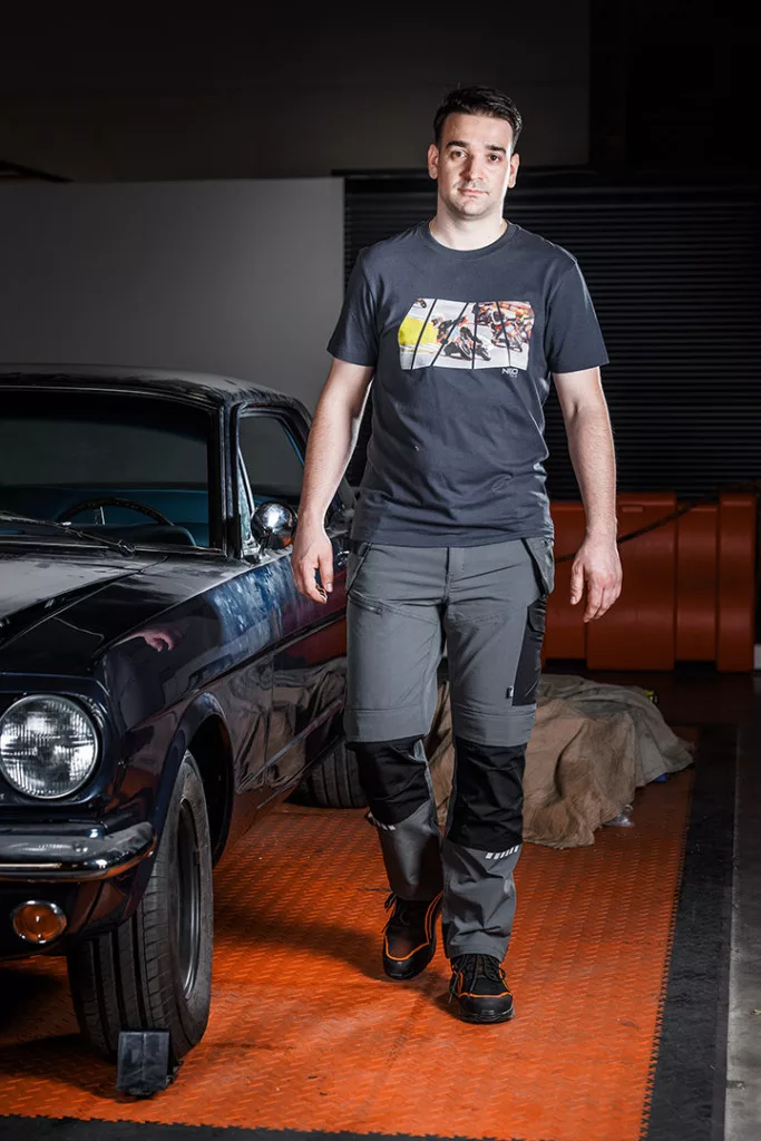 NEO 81-681 MUNKAVÉDELMI PÓLÓ, MOTORKERÉKPÁR MINTA, 100% PAMUT, 180G/M2. Kékesszürke színű, elöl nyomtatással. A fotónyomtatott grafika motorokat ábrázol . A nyomtatás a panelek szabálytalan formáiba van beépítve - a márka logóját is tartalmazza. Ez a dizájn a motorkerékpárok szerelmeseinek szól. A póló 180 g/m2 -es, 100% pamut kötött anyagból készült. A nyakra nyomtatott logó, valamint a névtábla megkönnyíti a ruhadarab személyre szabását. A póló kerek nyakkivágással rendelkezik, amelyet elasztikus szalaggal zárnak le. A NEO TOOLS márka egyedi, saját tervezésű darabja.