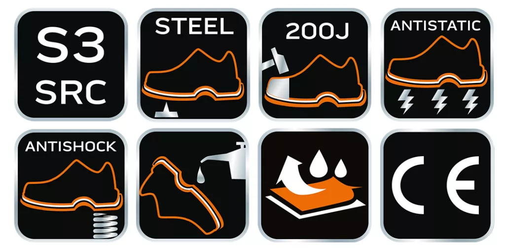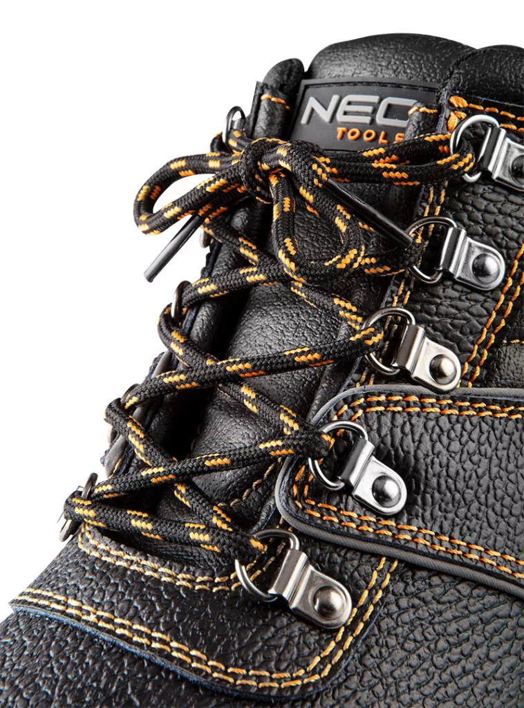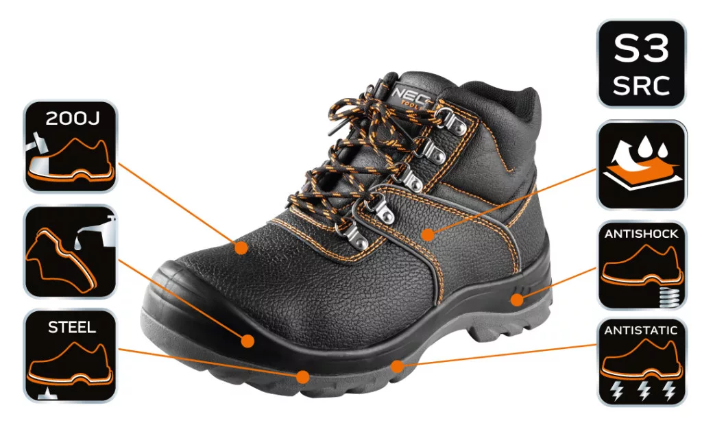 NEO S3 SRC minősítésű munkabakancs, acélbetétes orrmerevítővel és acél átszúrásgátló talpbetéttel a bitonságos munkavégzéshez. A bakancs hasított bőr felsőrésszel, a fűzőknél fémhurokkal rendelkezik. Dupla és tripla varrás megerősíti a lábbeli szerkezetét. Az acél lábfejvédő védelmet nyújt a 200 J energiával egyenértékű ütésekkel szemben, míg az ugyanebből az anyagból készült átszúrásgátló talpbetét védi a lláb alső részét. A két anyagból készült talp ellenálló az olajjal, benzinnel és más szerves oldószerekkel szemben. Anti-elektrosztatikus tulajdonságok jellemzik őket. Vízáteresztő és nedvszívó képessége megfelel az EN ISO 20345 szabvány szerinti biztonsági lábbelik osztályozásának. A bakancs töbféle méretben kapható.